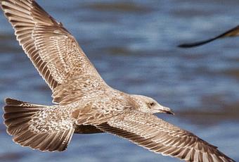Gaviota argentea americana Larus smithsonianus American Herring gullEsta gaviota es un primer invierno, segundo año calendario.Se ve mas marrón en general que su congénere europea, con pecho mas oscuro y un tono general mas marrón, en la fto de arriba podemos observar la diferencia en la cola con una patiamarilla de segundo invierno.
