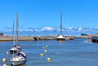 Gran parte de la actividad en Rhyl se centra en el puente del puerto de Pont y Ddraig , que tiene algunas de las mejores vistas de la ciudad, especialmente cuando los lados del puente colgante se levantan como alas para dejar pasar los barcos.