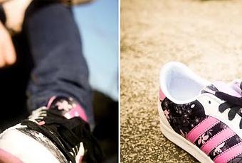 Fué entonces cuando me volví a transformar en "croqueta" y empezar a rodar por el suelo, haciendole unas cuantas fotos a las adidas de Vanesa. Los colores le dan una personalidad bastante fuerte, pero lo más llamativo, es la parte ilustrada de flores orientales, realizada con una textura suave de kimono japones.