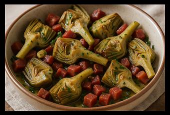 Hoy te propongo una receta clásica, fácil de preparar en casa y perfecta para compartir: alcachofas salteadas con jamón ibérico y un toque de vino blanco. Es uno de esos platos que no necesitan complicación para brillar y que, además, nos invita a hablar en la mesa sobre la importancia de la cocina sencilla, la de temporada y la que une generaciones.