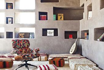 Hoy en Marruecos cerca de las montañas del Atlas ,el hotel Fellah es una mezcla de muebles vintage con la tradición marroquí y el kilim y las alfombras bereberes como grandes protagonistas en pufs , taburetes y sillones , y lo mas..... la butaca Eames tapizada ......que maravilla!
