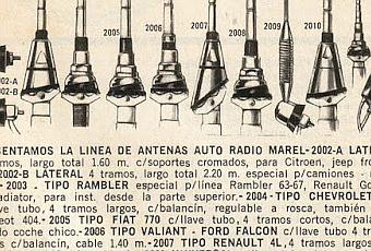 Lo interesante de esta publicidad aparecida en los avisos agrupados de la revista Parabrisas número 80 del mes de agosto de 1967, es tener una especie de catálogo con los distintos modelos de las antenas Marel. Incluso con la dirección de la empresa al pie.