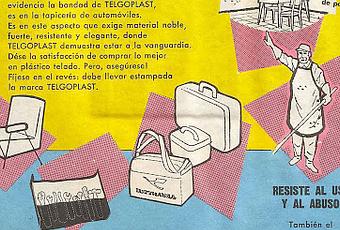 Se mencionan distintos elementos de uso cotidiano en nuestros hogares en la publicidad. Pero lo más curioso estaba del otro lado de la página de la revista Parabrisas número 10 de agosto de 1961, es decir 57 años en el tiempo. Había otra publicidad de Telgoplast con una muestra de tapizado.