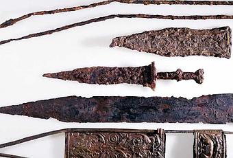Armas romanas, incluidas cabezas de pilum de hierro, puglia, hoja de gladius y la “espada Fulham” y su vaina, romano-británicas, vía Museo Británico La antigua Roma impuso su dominio, sobre la mayor parte del mundo antiguo conocido, mediante la guerra. El talento y el pragmatismo de los legionarios romanos a la hora de utilizar las armas fueron decisivos para su éxito.