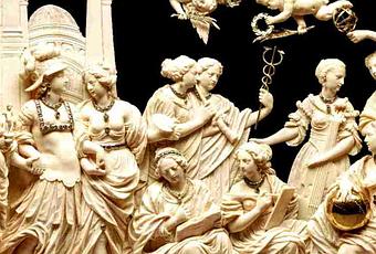 El museo anuncia una rica colección de esculturas en marfil con el calificativo de Splendid white. La mayoría de las obras son de una colección privada. Destacamos la escena de Minerva y las Artes Liberales, una obra delicada de finales del XVII que pertenecería a una Kunstkammer, un gabinete de curiosidades principesco. La Geometría tiene un compás metálico y un globo terrestre dorado, la Astronomía lleva una esfera armilar y la Aritmética calcula con una tablilla.
