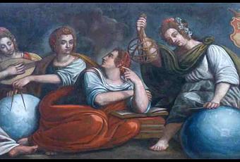 Nos fijamos en la representación de las siete Artes Liberales donde resulta curioso que la figura central sea la alegoría de la Justicia. Lo normal es que la figura complementaria sea Apolo, Minerva o la Filosofía.
