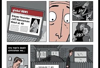 Ya han pasado unos días de la muerte de uno de los fundadores de Slayer,Jeff Hanneman.Pese a todo,el recuerdo por una persona que se ha ido no debería quedarse en el momento en que se sale por la puerta del cementerio o del crematorio.Un lector de blog,David Azofra,me ha pasado esta viñeta,muy buena y muy sentimental,que habla del efecto de la muerte de un ídolo en un fan de su obra ya maduro y con una vida mas o menos "estándar".Esta sacado de la web Zen Pencils,muy buena y recomendable como me ha dicho David.