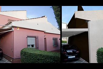 Las líneas de la fachada lateral han sido pulidas en concordancia con el nuevo diseño exterior de la vivienda. Se ha modificado la estructura del toldo plegable anterior por una rígida que carece de brazo. También de ha modificado ligeramente la chimenea, ahora con un diseño acorde con las formas de la fachada.