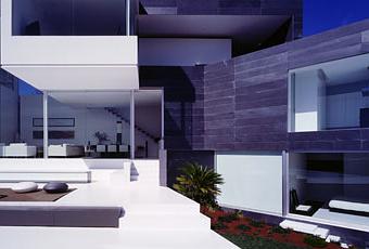 Esta idea se ha reforzado con la continuidad de paredes ,suelos y techos (todos en blanco). También las fachadas de los volúmenes principales, revestidas enteramente por una piel de pizarra, hacen invisibles la puerta principal y la del garaje con el mismo objetivo.