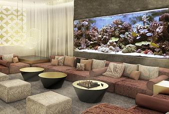 Las sala chill out se resuelve en color blanco y gris con mobiliario étnico y mesas auxiliares bajas. Para la iluminación se propone con un foseado en el techo y lámparas colgantes. La pecera ahora se integra en el muro, de mayor dimensión, logrando un mayor protagonismo.