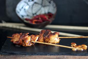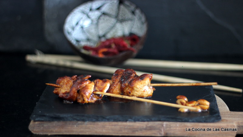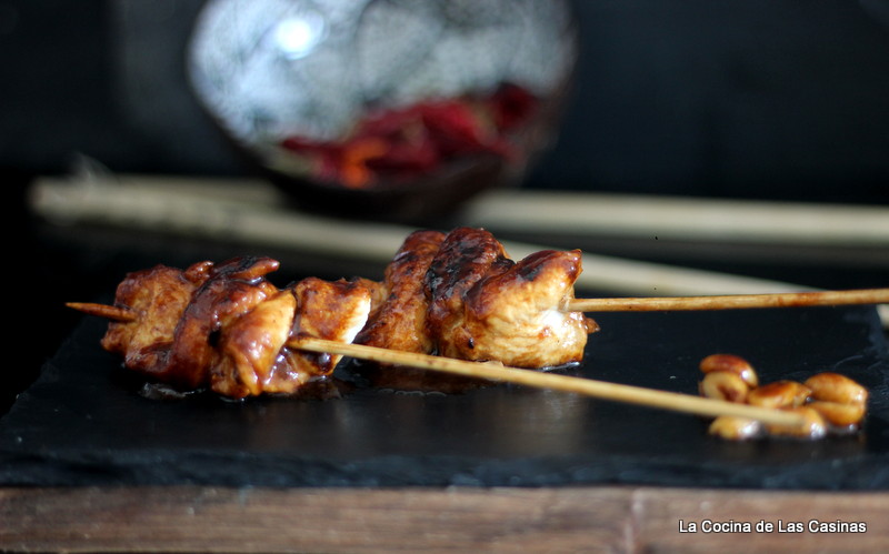 Macera la pechuga de pollo en todos los ingredientes, excepto el aceite vegetal, durante un par de horas, de vez en cuando dale una vuelta. Corta la pechuga en láminas muy finas. Empapa los palitos en agua para que no se quemen. Introduce las láminas de pollo. Calienta tu wok, plancha o sartén, añade el aceite y planchea las brochetas durante 2-3 minutos por cada lado. Retira, reduces el líquido de la maceración a fuego fuerte, vigila porque en dos o tres minutos estará. Salsea y sirve con los cacahuetes, le dan una textura especial y son fundamentales en la gastronomía Thai.