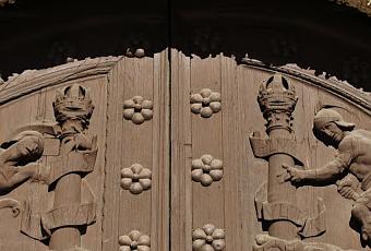 En ambas hojas de las pesadas puertas de madera vemos la representación de la escena de las llamadas "Columnas de Hércules".
