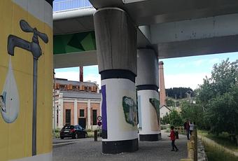 El artista urbano Asier Vera ha finalizado las tareas de intervención artística de las columnas y el frontal del puente del Centenario, las cuales dan la bienvenida a los visitantes de La Fábrica de Luz. Museo de la Energía.
