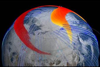 Los datos aportados por los modelos y los aportados por las observaciones satelitales muestran que, cuatro días después de la explosión del bólido, la parte más rápida y alta del penacho inicial, aquí mostrada en rojo, había dado una vuelta entera a todo el hemisferio norte y regresado a Chelyabinsk. (Imagen: NASA Goddard's Scientific Visualization Studio)Cerca de 3,5 horas después de la explosión, se detectó el penacho en la atmósfera a una altitud de cerca de 40 kilómetros (25 millas), moviéndose con rapidez hacia el este a más de 300 kilómetros por hora (unas 190 millas por hora).