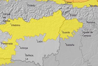 En la comarca del Bierzo, la alerta amarilla se extiende a todo el Alto Sil, con especial mención a Palacios y Páramo, pero también notable incidencia en municipios como Fabero, Toreno e incluso Igüeña. En Laciana, también Villablino aparece ‘coloreado’ en amarillo en el mapa de la Aemet.