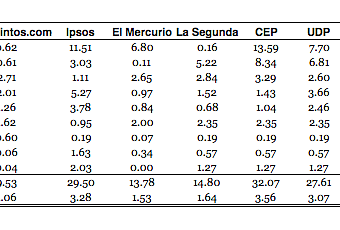 Más allá de los preliminares, podemos observar que la situación no es tan compleja como pudiera parecer a primera vista. Conecta se mantiene dentro o cerca del margen de error en todos los casos, Opina y La Segunda tienen errores relevantes en un candidato (Bachelet y Matthei respectivamente). Por otro lado, las encuestadoras grandes sí tienen diferencias importantes -CEP e Ipsos. Ahora bien, dado que hay una diferencia entre la fecha de las encuestas y la fecha de la elección, una diferencia de resultados es esperable porque entre medio bien puede cambiar la realidad (i.e que a la fecha de la encuesta la diferencia con el valor real era menor, y que los altos valores de diferencia sean además producto de una diferencia en la realidad). En otras palabras, los resultados no quieren decir necesariamente que CEP estuviera equivocado en la encuesta de Octubre.