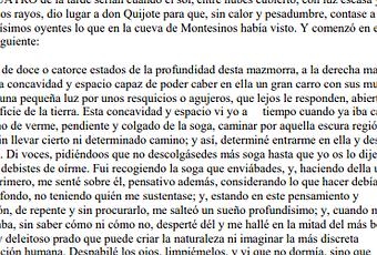 Inicio del capítulo XXIII de la segunda parte del Quijote (1615), donde el protagonista explica a sus acompañantes su experiencia en el fondo de la cueva de Montesinos. Apenas ha estado en ella unas horas, cuando el cree haber pasado tres días enteros, en parte porque se adormeció y le pareció luego despertar y adentrarse en un castillo transparentes, donde halló al mismísimo Montesinos, que a su vez le explica por qué está allí. Lo que interesa de este capítulo es, a efectos filosóficos, que en Don Quijote se dan las mismas razones que alega Descartes para defender su argumento del sueño, esgrimido en el Discurso del método (1637) y luego en las Meditaciones (1641).