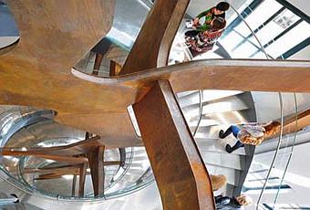 Esta nueva escalera orgánica surge de una escalara de emergencia original. Comunica las cuatro plantas del edificio en vidrio templado laminado 8+8 extra claro, apoyándose sobre una estructura de aspas de acero corten.