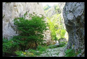 Cruzamos un puente de piedra y a la otra orilla nos espera una pendiente que si bien no es muy exigente parece empeñarse en acompañarnos durante un rato. Mientras ascendemos nos da por pensar que, además del runruneo del río más o menos cercano, una de las características más destacadas de este primer tramo del del sendero, el que nos conduce al desfiladero propiamente dicho, es el del verdor, que todo lo domina. Y aún cuando en la cubierta arbórea se abre algún claro, lo que se contempla entonces es una nueva gama de verdes que se elevan hasta la cima de las montañas cercanas.