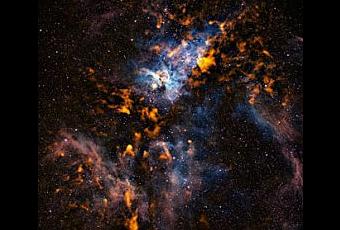 Usando la cámara LABOCA del radiotelescopio Atacama Pathfinder Experiment (APEX), en el llano de Chajnantor, a 5000 metros de altura en los Andes chilenos, un equipo de astrónomos dirigido por Thomas Preibisch (Universitäts-Sternwarte München, Ludwig-Maximilians-Universität, Alemania), en colaboración con Karl Menten y Frederic Schuller (Max-Planck-Institut für Radioastronomía, Bonn, Alemania), tomó imágenes de la región en luz submilimétrica. En esta longitud de onda, la mayoría de la luz detectada corresponde al débil calor que emiten los granos de polvo cósmico. Por lo tanto, la imagen revela las nubes de polvo y gas molecular –principalmente de hidrógeno- a partir de la cual pueden formarse estrellas. A -250ºC, los granos de polvo son muy fríos, y el débil resplandor que emana de ellos sólo puede ser visto en longitudes de onda submilimétricas, significativamente más amplias que las de la luz visible. Por esta razón la luz submilimétrica resulta clave para estudiar cómo se forman las estrellas y cómo interactúan con sus nubes progenitoras.