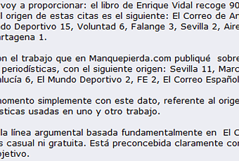 Perdónenme pero es que estas cosas a mí me hacen mucha gracia. Pretende decirnos de fondo que su trabajo sobre el Caso Antúnez basado en, atención, treinta y siete citas periodísticas, debe ser mejor que el libro de Enrique que utiliza nada más y nada menos que noventa y la mayoría de medios diversos, por lo que su información es muy plural.