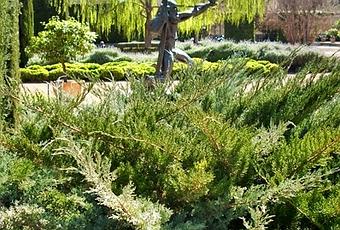 Porque las Hespérides eran las encargadas de vigilar las manzanas de oro con ayuda de un dragón que las protegía. Un dragón sagrado. Manzanas que fueron regaladas de Gea a Hera por su matrimonio con el propio Zeus. Siete eran las Hespérides. ¿Estarán escondidas entre las fuentes?Un jardín, quizá, demasiado ordenado y diseñado. Lineal. Rompiendo tópicos. Con ambientes muy diferenciados, pero con esas fuentes y pérgolas que rompen esa frialdad de la línea recta. Esculturas acompañadas de agua y del árbol de la vida. La escultura del héroe y del sagrado dragón enfadado y convertido en serpiente.