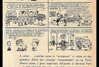 Hace unos años atrás publiqué una vieja publicidad con una historieta de Quino para el servicio oficial de Ford. Porque de eso se trataba esa campaña que estuvo vigente en el año 1966 y parte de 1967. Las piezas, o mejor dicho, las historietas, alababan el servicio que la empresa Ford Motor Argentina les daba a sus clientes.