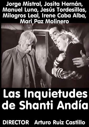 Las Inquietudes de Shanti Andia es la primera de las novelas que Pío Baroja dedica al mar, inclinado por el ambiente familiar marino y sus lecturas (se había zampado a Stevenson, Verne y Defoe). Y es también una de esas películas basadas en la calidad literaria del original, que conserva su dignidad, añadiendo características propias a la narración estrictamente visual. Pío Baroja, maestro de la economía expresiva, nos dejó en Las Inquietudes, una diatriba contra la vulgaridad frente a la uniformidad, un canto a la grandeza del mar (que conlleva respeto a su peligrosidad), y nostalgia de su bravura cuando uno se adocena en tierra. Obra atípica, frente al planteamiento de la cinematografía nacional en aquella época, volcada en folklores patrióticos casposos, risibles españoladas y comedias de teléfonos blancos. El director Arturo Ruiz Castillo realiza una película de aventuras; basada en la narración oral; con planificación intrépida, con angulaciones de cámara notables y primeros planos que reflejan la psicología de los personajes. El protagonista (Jorge Mistral) va uniendo retazos de vida, de historia, de sus antepasados, en base a un diario y los recuerdos que desgranan los personajes, interpretados por aquellos excelentes secundarios, que llenaban estas producciones de calidad, (impostaciones correctísimas de voz, expresividad natural, etc.). Lleno de nostalgia por el mar de antaño, Shanti rememora su historia y la de su tío: Juan de Aguirre, trasunto de marinos vascos, que fabricó continuamente su destino.