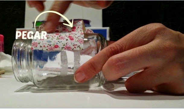 Una vez medido y cortado, comenzamos a pegar la tela adhesiva. En caso de ser tela normal primero debemos aplicar la cola disuelta en agua, alrededor del bote y luego vamos poniendo la tela y apretando con los dedos para que se valla fijando.