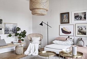 En este pequeño apartamento nórdico de 50 m² el bambú es protagonista en el salón junto con toques de color rosa milenial que tanto se ha llevado en las pasadas temporadas. Por cierto, que la lámpara de techo del salón es el famoso modelo sinnerlig de Ikea, seguro que ya la habíais reconocido.