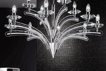 Esta lámpara de diseño moderno tiene bajo sus brazos de metal cromado unas piezas de cristal -que emulan a las plumas- y sobre los cuales se apoyan los platos de cristal de bohemia y los portavelas también cromados.