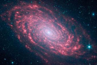 La galaxia del Girasol, M 63, observada en infrarrojo medio con el satélite Spitzer (NASA). Se combinaron datos en las bandas de 3.6 micras (azul), 4.5 micras (verde) y 5.8 y 8.0 micras (rojo). Para enfatizar la componente de polvo (que brilla en rojo a 5.8 y 8.0 micras), en esta imagen se ha restado la emisión estelar (que brilla en azul a 3.6 micras) a las imágenes a 5.8 y 8.0 micras. Crédito de la imagen: NASA / JPL-Caltech / SINGGS Team.