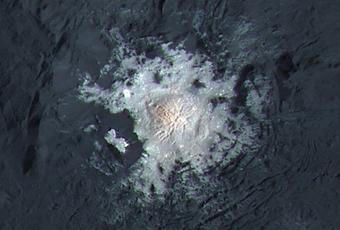 Es la hermosa mancha central del cráter Occator, de un precioso color blanco brillante y con cambios de tonalidad en su parte central, depósitos de sales según los últimos datos de la Nasa, pero con un origen aún incierto. Lo que sea que lo forma aún está activo, se ha comprobado que los materiales que la forman se volatilizan al estar bajo la luz del sol y la mancha no decrece por lo que existe una tasa de recuperación. (Muchos vemos la imagen y lo primero que pensamos es vaya pedazo de criovolcán tenemos delante)