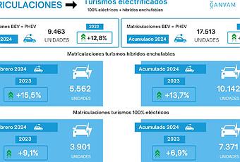 Las ventas de vehículos electrificados (eléctricos e híbridos enchufables, comprendiendo turismos, cuadriciclos, vehículos comerciales e industriales y autobuses) han logrado un nuevo crecimiento en febrero, con 10.083 unidades, que supone un 11,1% más que el mismo del año anterior y sumando el 10,3% del mercado. En los dos primeros meses, se han registrado un total de 18.644 ventas, un 8,8% más que en 2023.