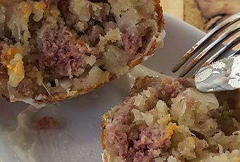 Era toda agradable a la vista, esa bomba, perfectita, con un poco de cebollino por encima de las salas. De tamaño medio y rebozado ni demasiado delgado, ni demasiado capa de cemento, me llamó mucho la atención la salsa picante, en la que directamente se veían las semillas del pimiento picante. Súper potente. El alioli es también de aquellos para los amantes de las emociones fuertes y de estómagos poco delicados. Por esta razón, al final ya no sabía muy bien detectar si sólo había ajo en la salsa, o también la patata y el sofrito, tanto una como el otro con una cantidad considerable de perejil. La cantidad de carne era más que decente, pero un poco seca. Me cortó un poco el rollo notar en el rebozado sabor a pescado. Aquello o bien se había frito con el mismo aceite de muchos pececillos o algún invento del estilo. Nada, un descuido, digo yo ... Costaba 1,70.