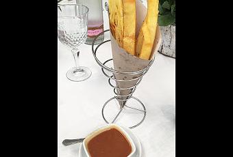 Precio: 9,50€.Las patatas están hechas al horno y son hojaldradas (buenísimas), lo que le da un toque original, nunca las habíamos comido así. La salsa está rica de sabor pero no pica nada.