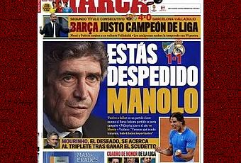La portada del lunes tiene mérito;con el ya famoso "Manolo , estás despedido", que menos mal que han puesto la foto de Don Manuel Pellegrini, sino el tal Manolo podría ser el del bombo de España o otro de los apóstoles de Marca; Manolo Lama, tras el ridículo más barriobajero de su bochornoso video.
