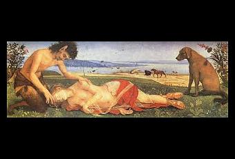 Cuenta el mito que el hijo de Hermes y Afrodita (llamado Hermafrodita, claro), era un adolescente hermoso, que un día, en uno de sus paseos, llegó a un lago de aguas transparentes, tan limpias que incluso podía verse su fondo, como ese lago, “la laguna de Dios”, descubierto recientemente en Australia. En él vivía la ninfa Salmacis, joven y muy erótica náyade, cuya ocupación consistía en adornarse con flores y velos primorosos para contemplarse después en el manso y reluciente espejo de las aguas. Al detenerse en la orilla del agua, Hermafrodita vio a Salmacis, quedando sorprendido y admirado por su belleza, pero cuando la ninfa le vio a su vez, se quedo sorprendida asimismo por su apostura y su belleza, quedando inmediatamente prendada de él, por lo que le dijo: “Feliz tú que si eres mortal y feliz la mujer que te ha nutrido en su seno, pero mucho mas feliz tu amada, si es que la tienes, pero si ella no existe todavía, si tu corazón es virgen todavía a los deseos y al amor, yo te amo, te deseo y quiero compartir contigo mi lecho." Hermafrodita, que ignoraba todo respecto al amor, se sonrojó al oír las apasionadas palabras de la náyade y huyó apresuradamente. Ella se dolió de su marcha pero nada hizo por retenerle, diciéndose a sí misma: “Insistiendo en mi ofrenda sólo conseguiré intimidar aún más a ese joven tan hermoso. Lo mejor será ocultarme y dejar que el tiempo trabaje a mi favor.”