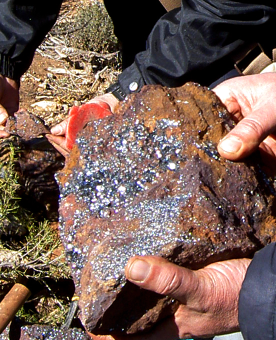 Hematites especular. Minería del hierro en Murcia. Las minas de hierro de los Almagros, término de Fuente Alamo, Murcia, se presentan como rozas y pozos que explotan filones y bolsadas de hematites, relleno de cavidades kársticas, en una sucesión de agrupamientos de pequeñas labores, al sureste de la Sierra de Carrascoy, siguiendo el camino que lleva a Casa de Ros desde Los Almagros. La solana de Carrascoy es rica en estas mineralizaciones, entre la pedanía de La Murta y el Cabezo del Charco. Todas ellas fueron abandonadas a prinicipios del sglo XX.