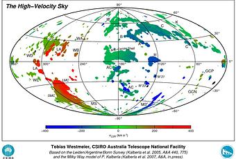 Además de los cúmulos globulares y las corrientes de marea de galaxias satélites que están siendo destruidas por nuestra Galaxia, alrededor de la Vía Láctea (quiero decir, en su halo) también se encuentran unas nubes de gas neutro que se mueven a alta velocidad. Precisamente estas características les valieron el nombre de nubes de alta velocidad (High velocity clouds, HVCs, en inglés). Se descubrieron por primera vez con radiotelescopios en los años 60 del siglo pasado. Gracias a las observaciones actuales usando radio-interferómetros y grandes radio-telescopios (que es prácticamente la única manera que tenemos de verlas, insisto en que son nubes de hidrógeno neutro, que se observa a longitudes de onda de 21 cm) sabemos estas nubes (que se mueven a más de 70-90 km/s más rápido que el gas que correspondería al disco de la Vía Láctea en la misma zona) suelen tener masas de varios millones de veces la del Sol y están repartidas por todo el cielo.