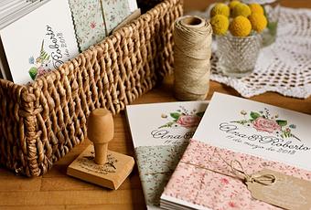 Y para completar el conjunto, cerramos todas las piezas con diferentes telas con estampados florales, y con un cordel que se cerraba con un lazo y una etiqueta con el logo de la boda estampado en color blanco sobre kraft, igual que en el sobre.