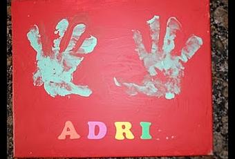 Lienzo pintado con témpera y sus manos impresas con pintura de dedos. Las letras son de goma eva