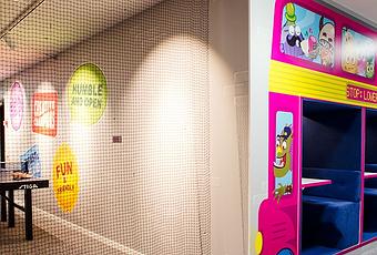 El comedor contiene asientos que parecen “trampolines” y las mesas son similares a carruseles.