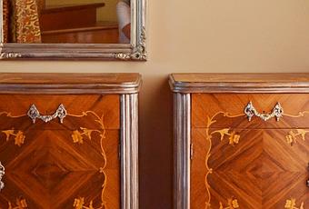 Simplemente quitamos el antiguo lustre de la madera, y revelamos el maravilloso trabajo de marquetería de los muebles. Trabajamos con pátina en color plata sobre molduras, cantos y patas.