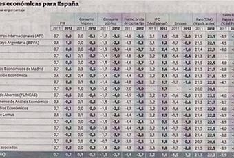 Y sus profundos conocimientos, sobre los que se asientan las economías occidentales, quedan claramente reflejados en los datos que la tabla de El País nos ofrece. Por eso, unos "expertos" ven en su bola de cristal que nuestro PIB se reducirá un 0,5 % (FUNCAS) mientras el "experto" BBVA ve en su tarot que crecerá un 1 %. Un "experto" dice que el consumo de los hogares va a incrementarse un 1 % (Esade) mientras otro afirma que decrecerá un 0,4 % (la pesimista FUNCAS de nuevo). Los "expertos" del Banco de Santander y del Centro de Predicción Económica sólo ven en los posos de sus tazas de café un 0,9 % de reducción en el consumo público mientras las líneas de la mano del "experto" Instituto Complutense de Análisis Económico eleva el dato negativo hasta el 4,5 %. Así mismo, el "experto" Intermoney coloca el IPC de 2012 en el 0,5 %, mientras la "experta" Bankia lo lleva al 2,4 %. Y así continúan los ejemplos... Sólo hemos de fijarnos un poquito en la tabla y aplicar el sentido común para llegar a la conclusión de que o todos los "expertos" son unos ineptos, o una buena parte de ellos nos mienten, o sus resultados responden a intereses que no confiesan o todo a la vez...