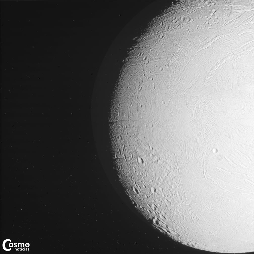 En otras imágenes, Encélado pone su escarpada cara al frente, exhibiendo algunas de las fracturas y la formación de cráteres que han hecho de esta luna de Saturno una de las favoritas de los científicos planetarios. Una vista de Encélado fue tomada por Cassini el 18 de mayo a aproximadamente 75.000 kilómetros de distancia (ver imagen).
