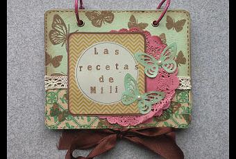 Dejando a un lado los sentimentalismos, volvamos al tema principal. Esta vez era tarea fácil, a ella le encantan las mariposas, así que la portada no debería llevar ninguna otra cosa que no fueran mariposas. Me decante por un estilo vintage and chic con colores muy, muy alegres, de acuerdo con su personalidad. Quizá lo que más llame la atención de este recetario es su estructura, en la foto lo veis cerrado, pero al abrirlo, podemos atar el lazo por el lado contrario, de forma que lo convertimos en una especie de atril, esto le permite a Mili tener mayor comodidad a la hora de cocinar. Ya en su interior, le he puesto un montón de fichas para anotar sus mejores recetas y además unos separadores que le permita diferenciar entre primeros platos, segundos y postres.