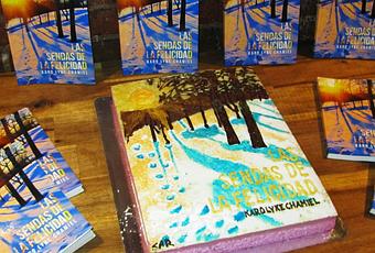Pastel realizado para la Presentación del Libro Las Sendas de la Felicidad, de KaroLyneChamiel, el pasado 29 de noviembre. Bavarois de Frambuesa y Limón con Albahaca, decorado con Azúcar Glass, Chocolate Blanco, Chocolate Negro y Colorantes Alimentarios.