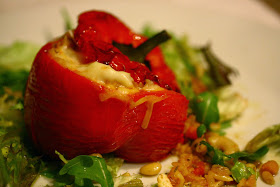 Mientras tanto, brindar por algunos piñones en una sartén seca. Ponga un poco de lechuga en un plato y moler un poco de sal y pimienta y rociar con aceite de oliva. Añadir los piñones y, si es necesario. unos aros de cebolla. Ponga los pimientos en él y tiene un delicioso plato de pudín.