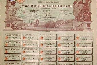 El nombre de esta empresa es "Minas de Castilla la Viehja y Jaén" constituida en 1907 (se ve bien si se descarga la imagen y se amplia un poco). Tiene su domicilio social en Madrid. Su capital social es de 5.000.000 de pesetas y el valor nominal de esta acción es de 500 pesetas.Fijaos un poco en la decoración del cuerpo principal de la acción con motivos alegóricos a la actividad de la Sociedad.